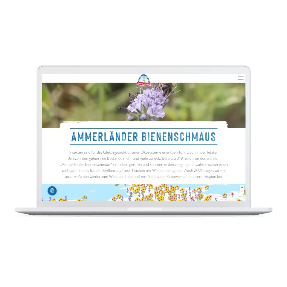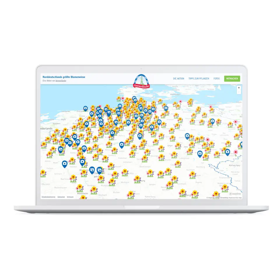 Interaktive Multi-Channel-Kampagne für die ArtenvielfaltAmmerländer ist die Eigenmarke der genossenschaftlichen Molkerei Ammerland aus Wiefelstede - einem der größten und modernsten Milchwirtschaftsbetriebe Europas. Mit der Milch von regionalen Milchlieferanten werden faire Milcherzeugnisse produziert. Die wichtigsten Gebote sind dabei das Tierwohl, die Nachhaltigkeit und die regionale Verantwortung. Zum Wohl der Insekten und für die Artenvielfalt entsteht die Idee des Ammerländer Bienenschmauses. Gegen den fortschreitenden Rückgang des Insektenbestandes wird ein Impuls für die Bepflanzung freier Flächen mit Wildblumen gesetzt. Die Blumensaat wird an Ammerländer-Kunden in ganz Deutschlandverteilt und von ihnen ausgesät. Eine interaktive Karte macht eine digitale Aussaat und die Verknüpfung mit Bildern aus den sozialen Medien möglich.