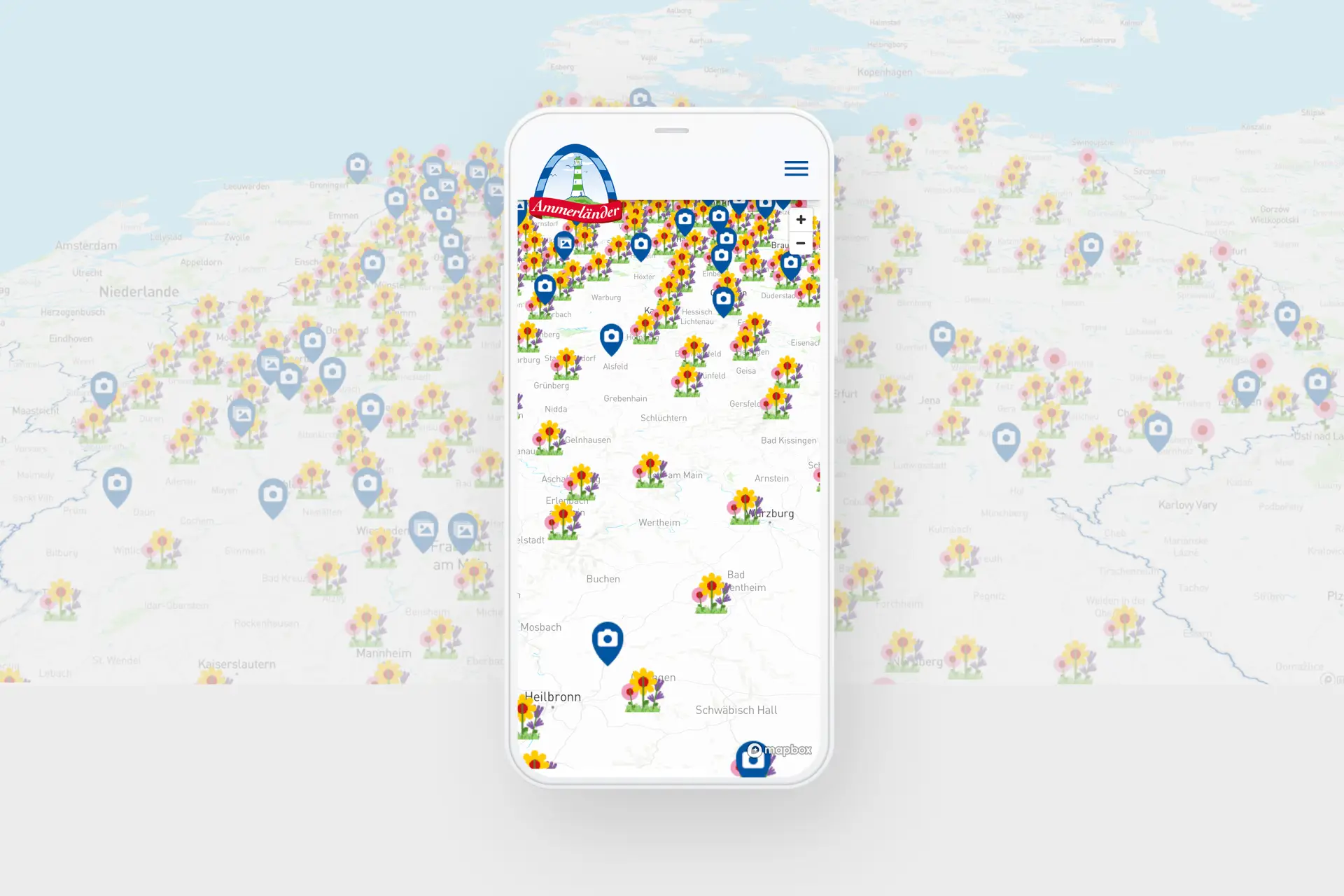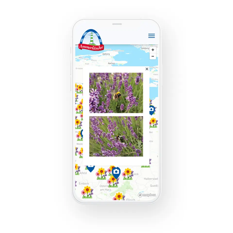 Dank der Mapbox-Integration und der Anbindung der Postleitzahlen-Datenbank sowie einer umfangreichen Aktionscode-Datenbank können die Ammerländer-Kunden über die Eingabe der Daten ihre echte Aussaat digital platzieren. Wir entwickeln eine eigene Facebook-App zum Auslesen der Kampagnen-Hashtags aus den sozialen Medien und integrieren die Bilder auf der Bienenschmaus-Landingpage - verknüpft mit der digitalen Aussaat auf der Karte. Im Admin-Backend kann das Ammerländer-Team die Uploads verwalten und bei Bedarf löschen.