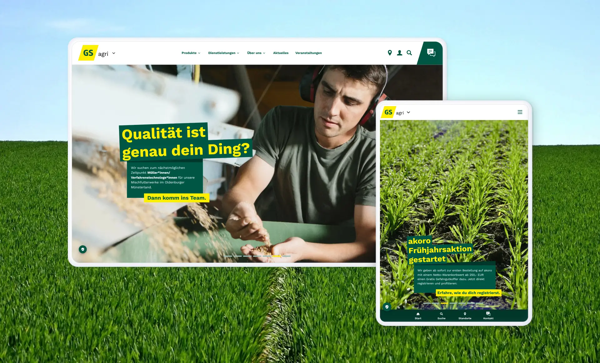 Die Website der GS agri eG, einer unserer langjährigen Bestandskunden, war längst in die Jahre gekommen, organisch ge- und vielleicht auch etwas verwachsen und konnte die fünf verschiedenen Geschäftsbereiche nur unzureichend abbilden. Ein Relaunch inkl. umfassendem CMS stand an. Ein zentraler Wunsch im Projekt war eine responsive Website, die auf allen Geräten optimal funktioniert. Das CMS sollte zudem den Redakteuren aus den verschiedenen Bereichen individuelle Zugriffsrechte und Möglichkeiten geben, Inhalte zu pflegen. Parallel beauftragte die GS Genossenschaft eine Markenagentur mit der Erstellung einer neuen, modernen Markenstrategie: "GS - Gemeinsam wachsen" und beauftragte uns mit der Co-Konzeption und Umsetzung der neuen Corporate Website.