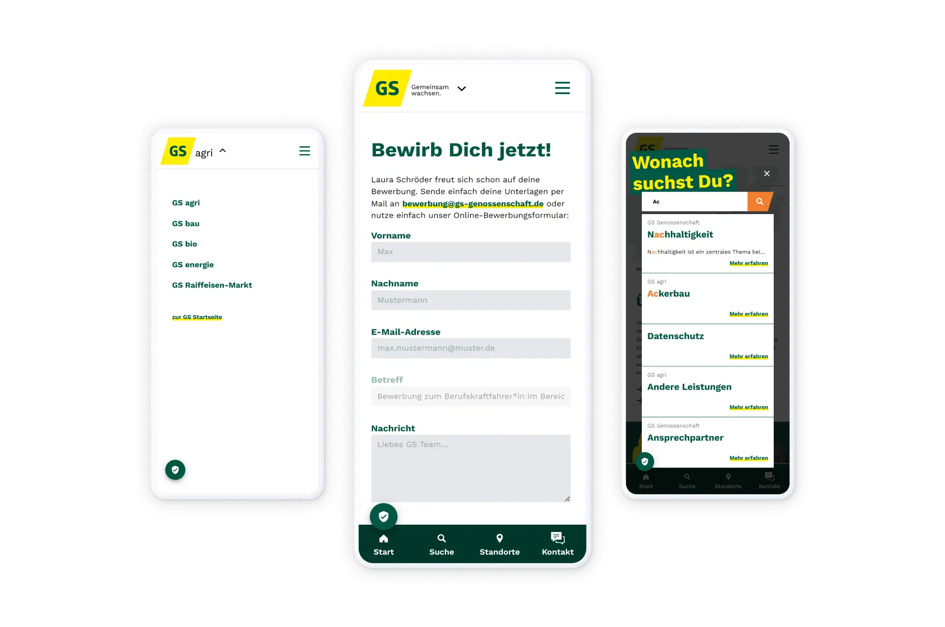 Die Website der GS agri eG, einer unserer langjährigen Bestandskunden, war längst in die Jahre gekommen, organisch ge- und vielleicht auch etwas verwachsen und konnte die fünf verschiedenen Geschäftsbereiche nur unzureichend abbilden. Ein Relaunch inkl. umfassendem CMS stand an. Ein zentraler Wunsch im Projekt war eine responsive Website, die auf allen Geräten optimal funktioniert. Das CMS sollte zudem den Redakteuren aus den verschiedenen Bereichen individuelle Zugriffsrechte und Möglichkeiten geben, Inhalte zu pflegen. Parallel beauftragte die GS Genossenschaft eine Markenagentur mit der Erstellung einer neuen, modernen Markenstrategie: "GS - Gemeinsam wachsen" und beauftragte uns mit der Co-Konzeption und Umsetzung der neuen Corporate Website.