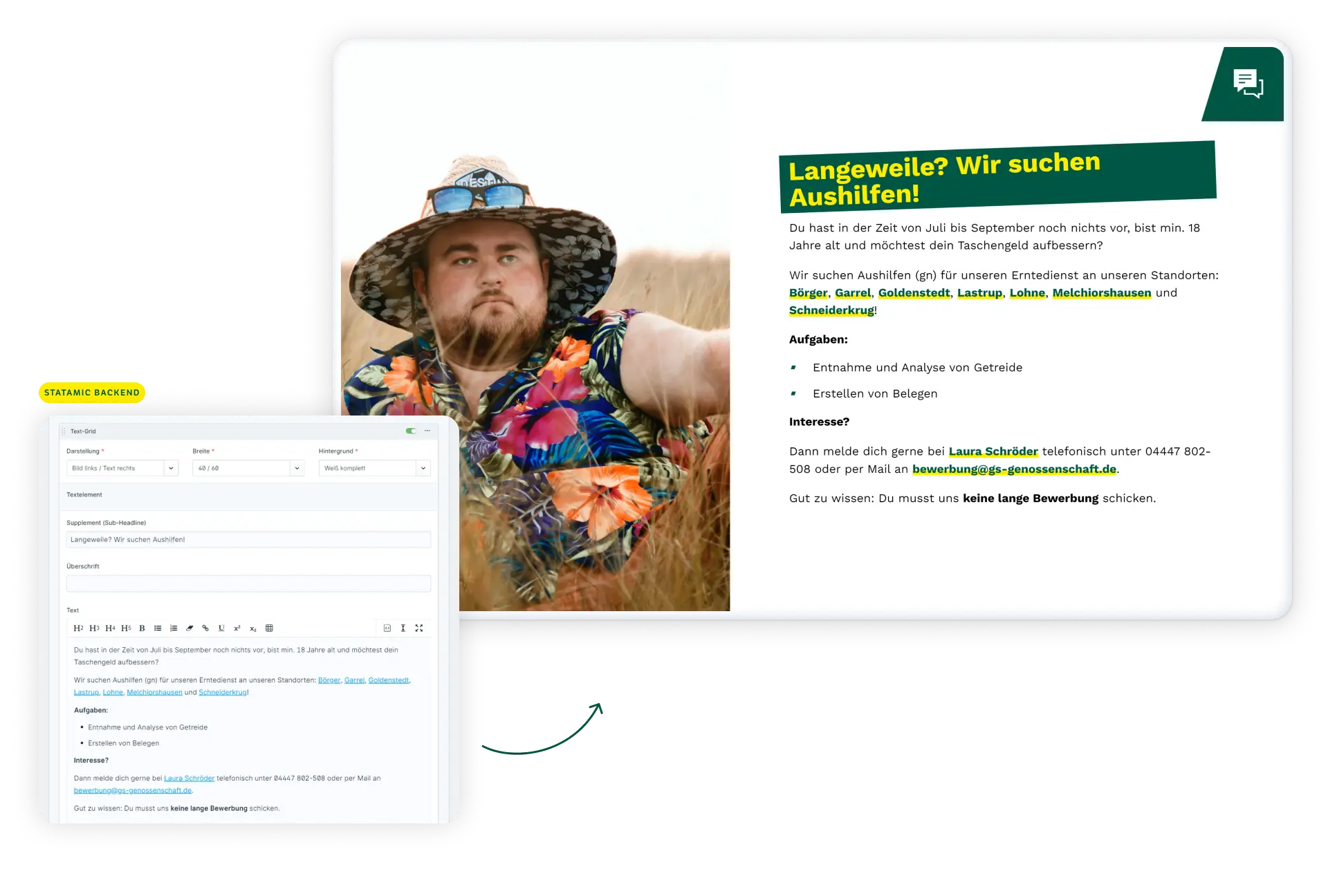 Während wir der Website in der Umsetzungsphase mit dem CMS Statamic ein solides Gerüst verpassten, schufen die Mitarbeiter aller Geschäftsbereiche Räume für individuellen Content. Über ein umfangreiches Rollen- und Rechtesystem in den einzelnen Geschäftsbereichen konnten die Redakteur:innen die Seite binnen weniger Wochen selbständig aufbauen.